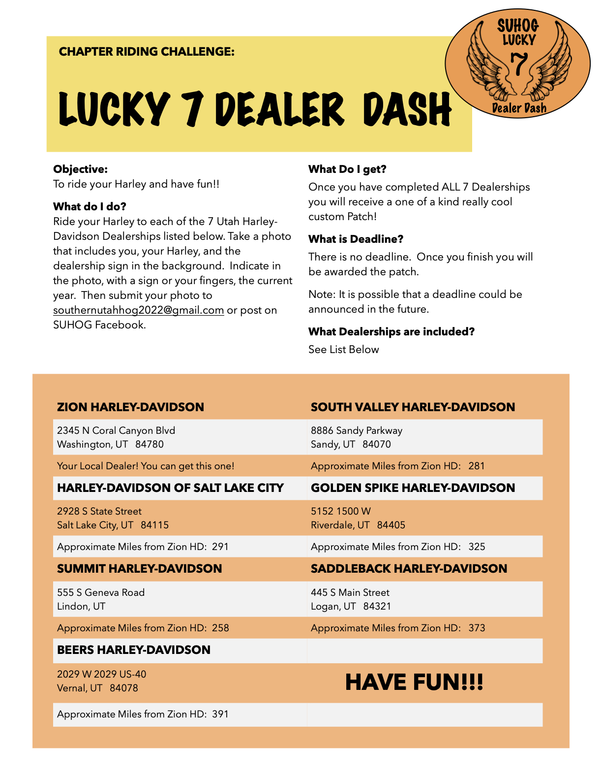 This Challenge ride is designed to encourage members to enjoy their own riding adventure, while collecting miles for the club. Of course, any miles you ride count towards the National HOG "Ride 365" mileage rewards. If you ride to each of the 7 dealerships and follow the instructions below for documenting each dealership, you are eligible to receive a one of a kind custom patch. YOU MUST RIDE TO ALL 7 UTAH DEALERSHIPS AND SUBMIT THE 7 PHOTOS BY NOVEMBER 1, 2023 TO BE ELIGIBLE FOR THE PATCH. If you complete both the Lucky 7 Dealer Dash AND the 6 Point you are eligible for a bonus challenge coin. Addresses for each Dealership is provided in the Lucky 7 Dealer Dash Flyer. You can do it all in one ride, or break it up into as many rides as you want. You can do it solo, or with a group of friends. Below are the requirements to successfully complete this challenge ride.